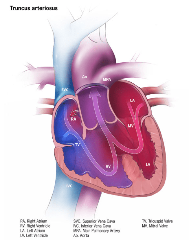 Katarina Anja or as we affectionately call her “Katja” was born with a rare CHD called “Truncus Arteriosus” (TA). This means that Katja was born with only one artery into her heart. In a normal heart you have both a pulmonary and aortic artery to your heart. The right side of the heart pumps oxygen-poor blood through the pulmonary artery to the lungs. The left side of the heart pumps oxygen-rich blood through the aorta to the rest of the body. In babies with TA, oxygen-poor blood and oxygen-rich blood are mixed together (the red and blue blood shown as purple in the photo below). This causes too much blood to the lungs and the heart works harder to pump blood to the rest of the body. This causes TA babies to sometimes be “cyanosis” or blue tinted. They also have a large hole or VSD in the heart.