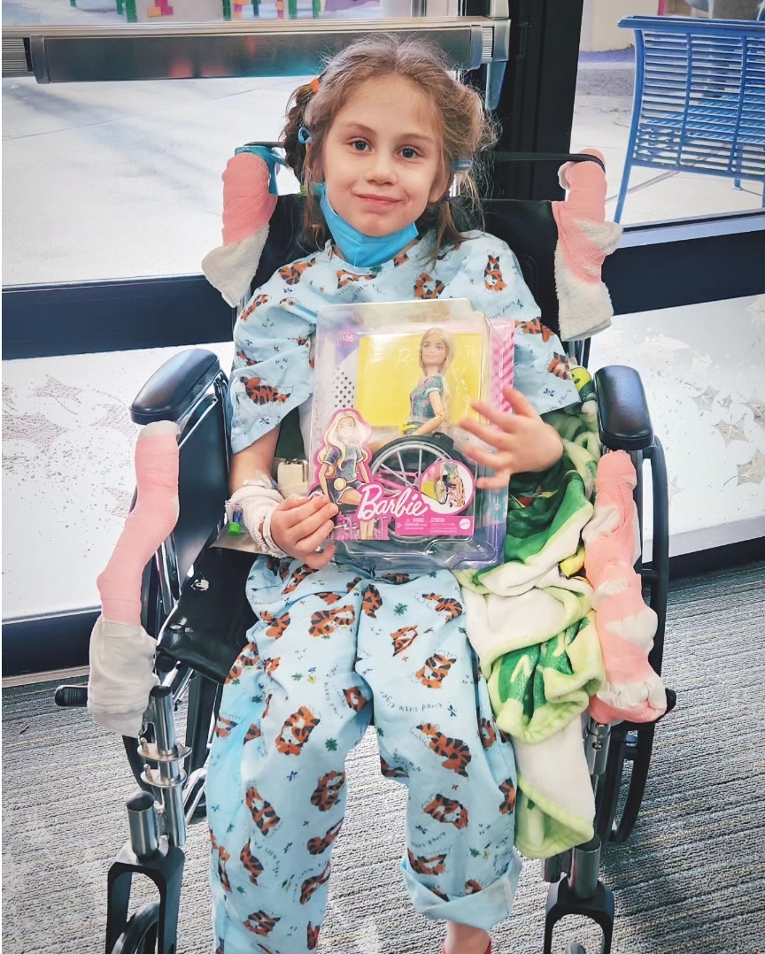 After much consideration, they’ve decided a wheelchair will be best for now. She has a temporary one while inpatient that she got to decorate with pink tape and a matching Barbie in her own chair 🤗