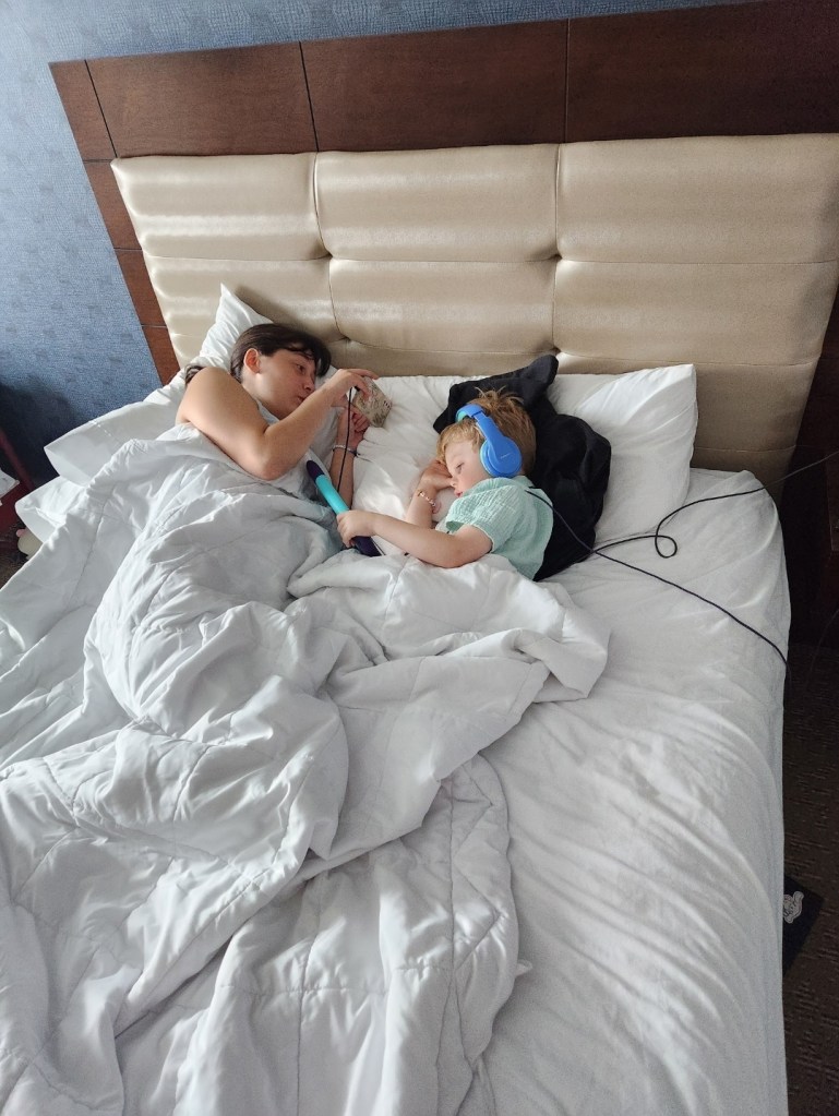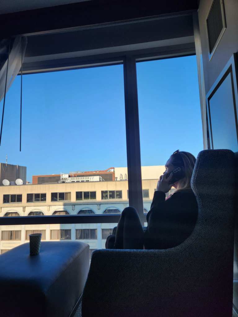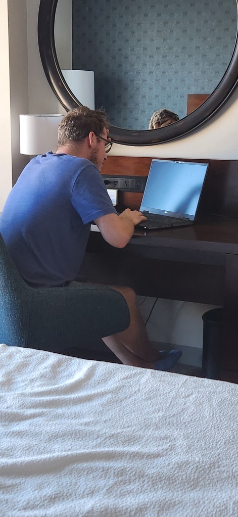 Through all of this chaos, fighting kids, wife in calls, worrying about Katja, having her melt down all day, on pins and needles every time our phones ring… Is Jori. Working. How he can even focus, I don’t know but he sits at this tiny cramped desk, typing away. When he gives us a 2 mins warning of a meeting, I usher everyone into the adjoining room and close the connecting doors so he can have some peace. But who am I kidding? The doors are paper thin and the kids are loud. I see the stress in his face, as clearly as he sees it in mine. Hotel beds suck. We aren’t getting enough sleep, our backs hurt and all of us are depressed of hotel room walls.